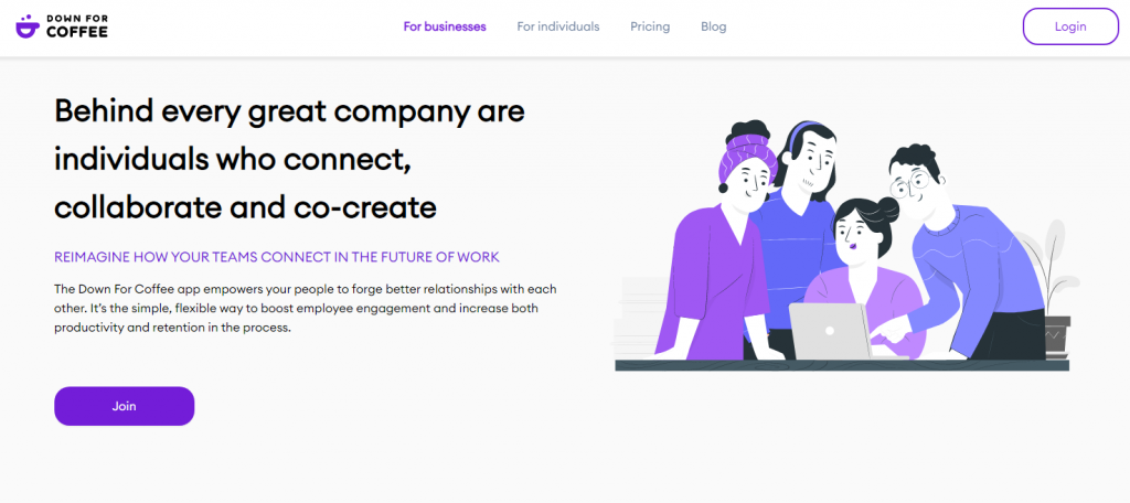 Down for coffee match employees randomly across the organization for meet-ups based on availability and interests.