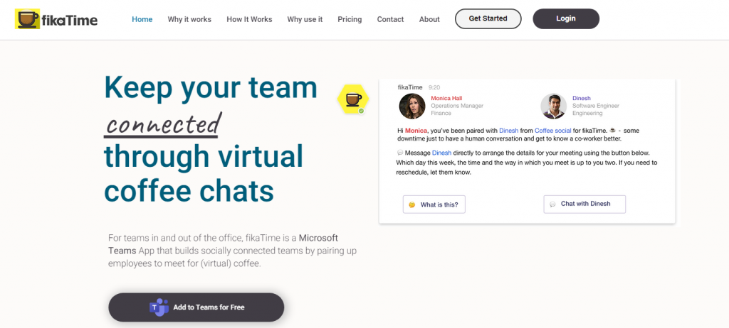 FikaTime is a Microsoft Teams App for team building and builds connected teams by pairing up employees to meet for virtual coffee.