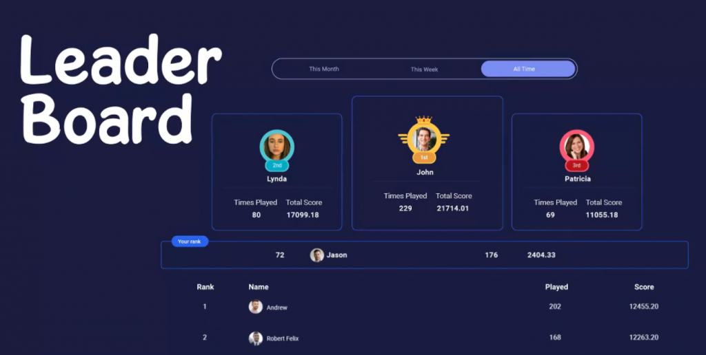 You can organize quizzes and games for anyone to play. It acts as a quick break while engaging with other colleagues and contributing to team building. Leaderboard and real-time scoring build a healthy competition and incentivize them to play more games.