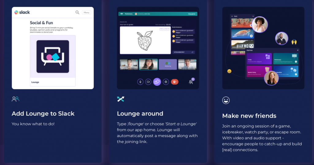 Trivia is a virtual team-building software for employee engagement and fun activities. With Lounge, we are providing a version that allows you to leverage audio and video as well for connecting with employees and building strong teams.