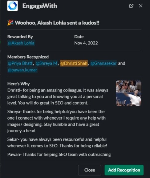 - Peer-to-Peer Recognition ~ Did your peer help you in a task? Did they do a very nice job in handling a Lead? Reward and recognize your peers for all their big and small achievements / contributions. Each kudos adds 20 points (100rs) and each shoutout adds 200 points (INR 1000) to their wallet.