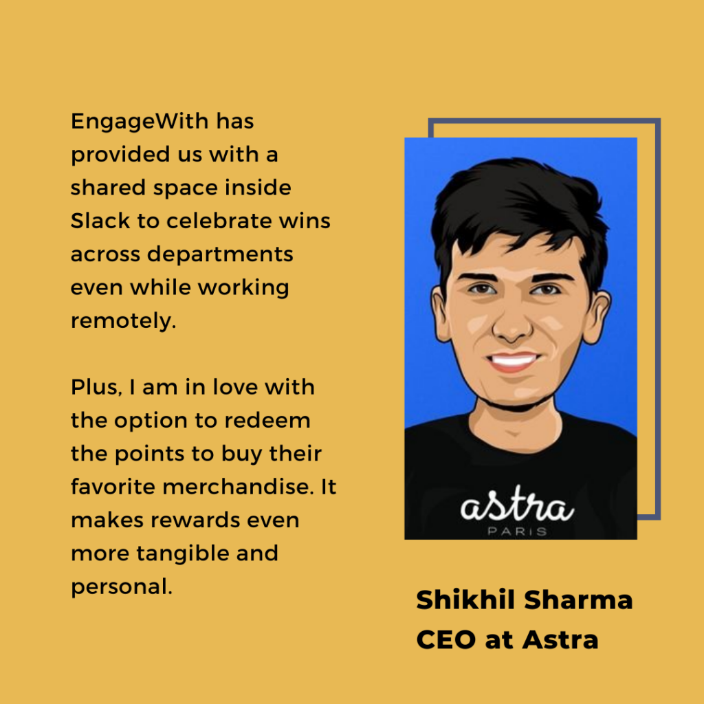 Shikhil proudly added, ”However, EngageWith doesn’t just stop with giving recognition. It helps my people redeem those points received on their preferred e-commerce sites. This makes the recognitions more personal and tangible.”