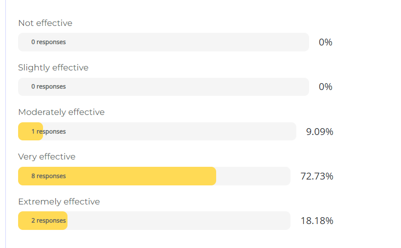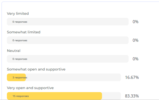 What a Positive Result Can Indicate: Positive results indicate that the team has established a strong foundation of open and supportive communication. This suggests a healthy team dynamic where members feel safe to share ideas, feedback, and concerns. It also reflects a culture of transparency and trust, which are crucial for collaboration and problem-solving. To sustain this, continue promoting regular and meaningful communication practices.