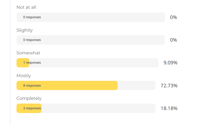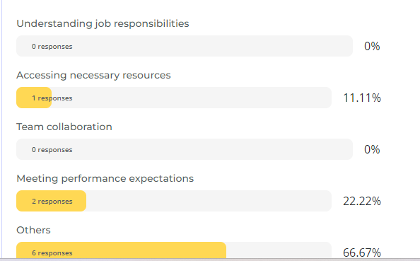 What a Positive Result Can Indicate: Positive responses, where challenges are manageable or minimal, indicate that new hires are well-equipped and supported in their roles. This suggests that the company has effective training and resource allocation, ensuring employees can meet expectations without undue stress. It also reflects a clear understanding of role requirements and accessible resources.