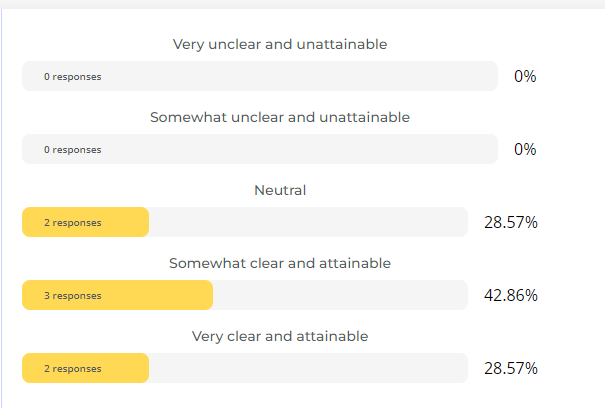 What a Positive Result Can Indicate: Positive responses suggest that employees are setting clear and ambitious short-term goals, indicating strong engagement and a desire to contribute meaningfully to the company. It reflects a culture that encourages goal setting and provides the necessary support and resources to achieve these goals, fostering a productive and motivated workforce.