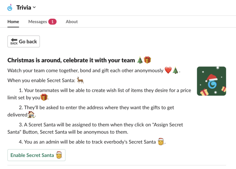 Seamless Activation: Getting into the holiday spirit has never been easier! Simply access the Trivia Homepage within Slack, enable the Secret Santa feature, and let the enchantment unfold. With just a few clicks, kick-start the joyous tradition of Secret Santa among your team members.