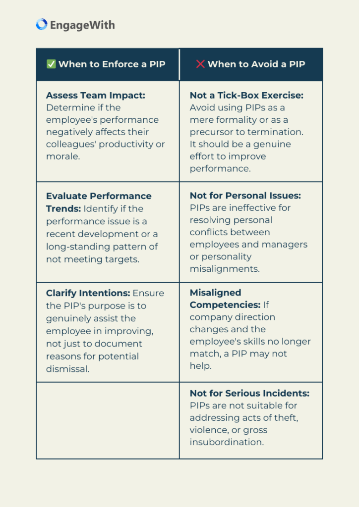 Timing is everything when it comes to PIPs. Rolling out a PIP at the wrong time or in the wrong way can lead to stress, disengagement, and even legal issues. Here are some tips on when to implement a PIP: