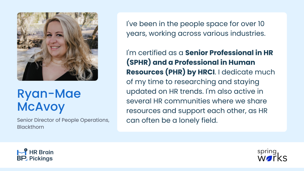 Ryan-Mae: Well, I don’t think that’s just an HR responsibility. Leaders in management need to understand whether the company is a people-first organization or a profit center. Where does your company land on that spectrum? One person can’t be the sole carrier of culture or balance all these aspects alone.