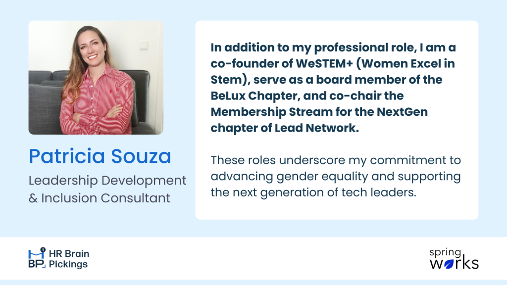 Experiencing expatriation herself as a Brazilian in Europe was eye-opening. Initially, Patricia wasn’t aware of diversity, equity, and inclusion (DEI) as a topic and the science behind it. Being part of a global organization exposed her to different cultures and gave her her first true understanding of inclusion. This experience made her realize the biases and discrimination minorities face at work, pushing her to work harder for the recognition and advancement of DEI in the workplace.