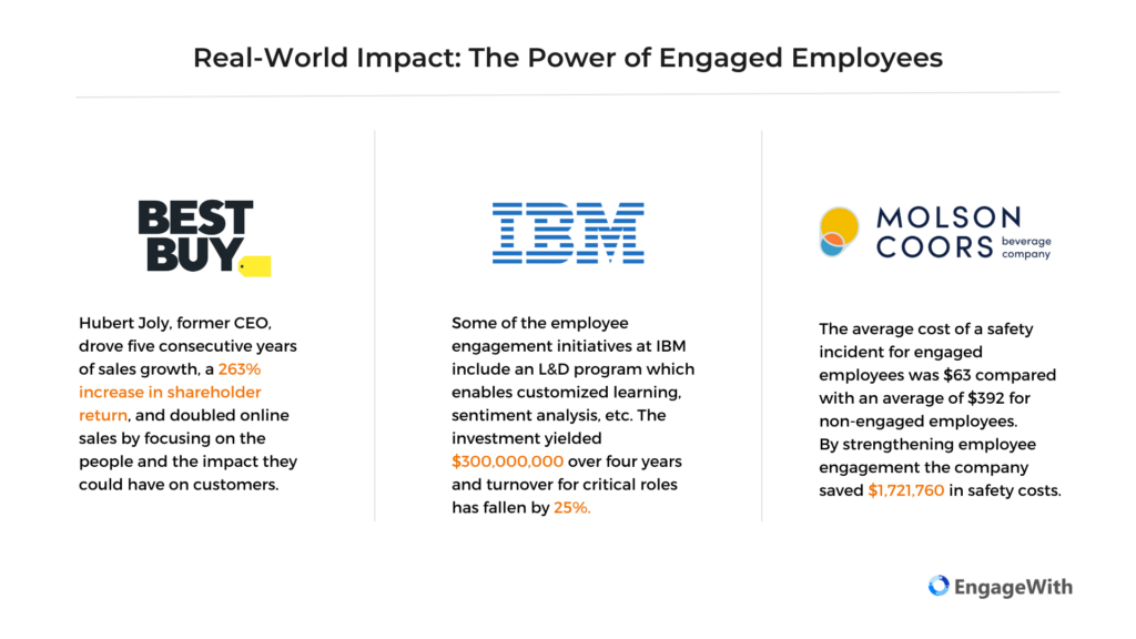 Taking the example of Best Buy – by focusing on revenue growth, we can see the effect of engagement drivers such as meaningful purpose, autonomy, and transparency on employee engagement. This heightened engagement positively impacts work performance and commitment, leading to better customer service and increased sales.